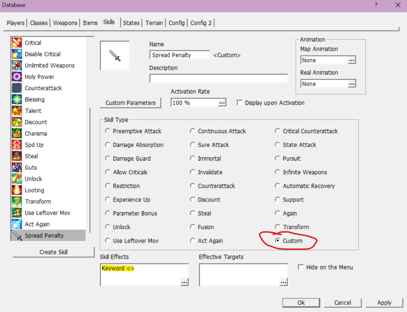 This custom skill can be implemented from the main screen of SRPG Studio by going into Database > Skills, then setting the Skill Type of the skill you want to associate with the plugin to “Custom”.
