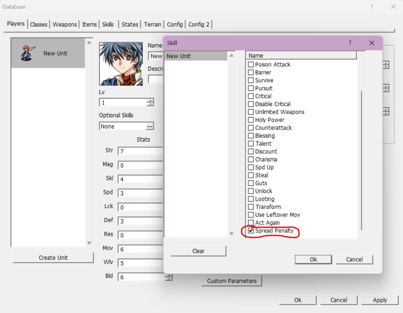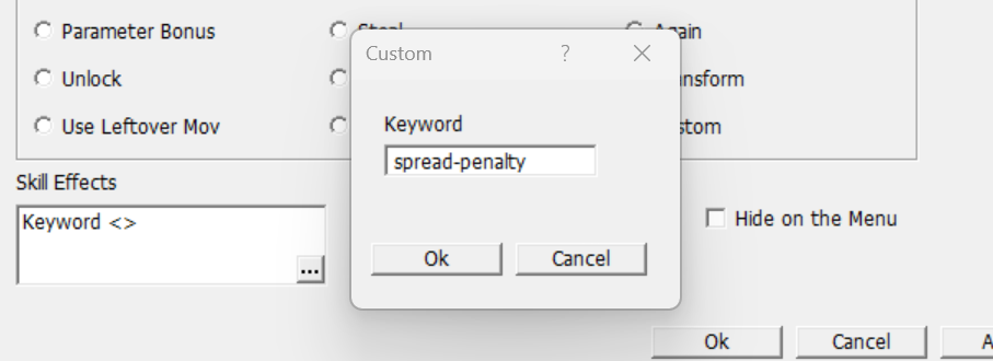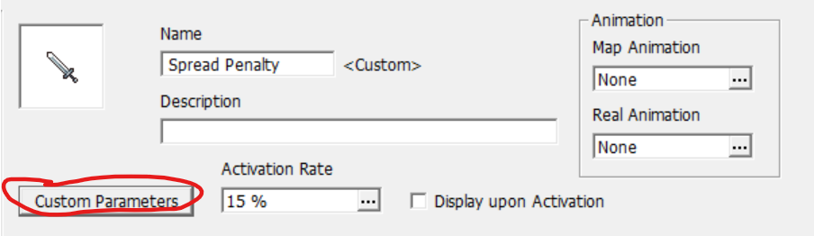 Spread Penalty does in fact have three custom parameters that can be modified to change the way they plugin works. However, within the JavaScript file for Spread Penalty, default values have been assigned to them to them - therefore Spread Penalty can be considered plug and play because you don’t necessarily have to define them. Remember to open the JavaScript files for your plugins and read the instructions for each case-by-case basis to determine if any custom parameters they use also have default values! Define custom parameters you want to change by clicking on the “Custom Parameters” button for the corresponding skill, then typing them in the window that appears.